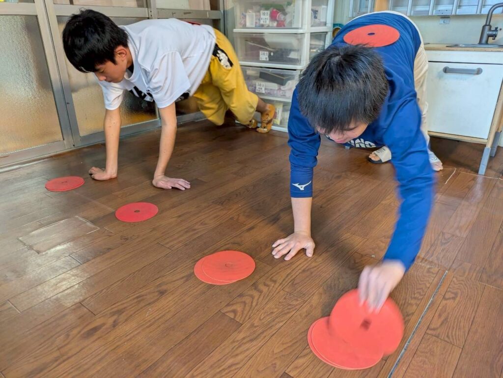 「腕立てマーカー集め」では、体を支えながら左右交互にマーカーを集めるチャレンジ!